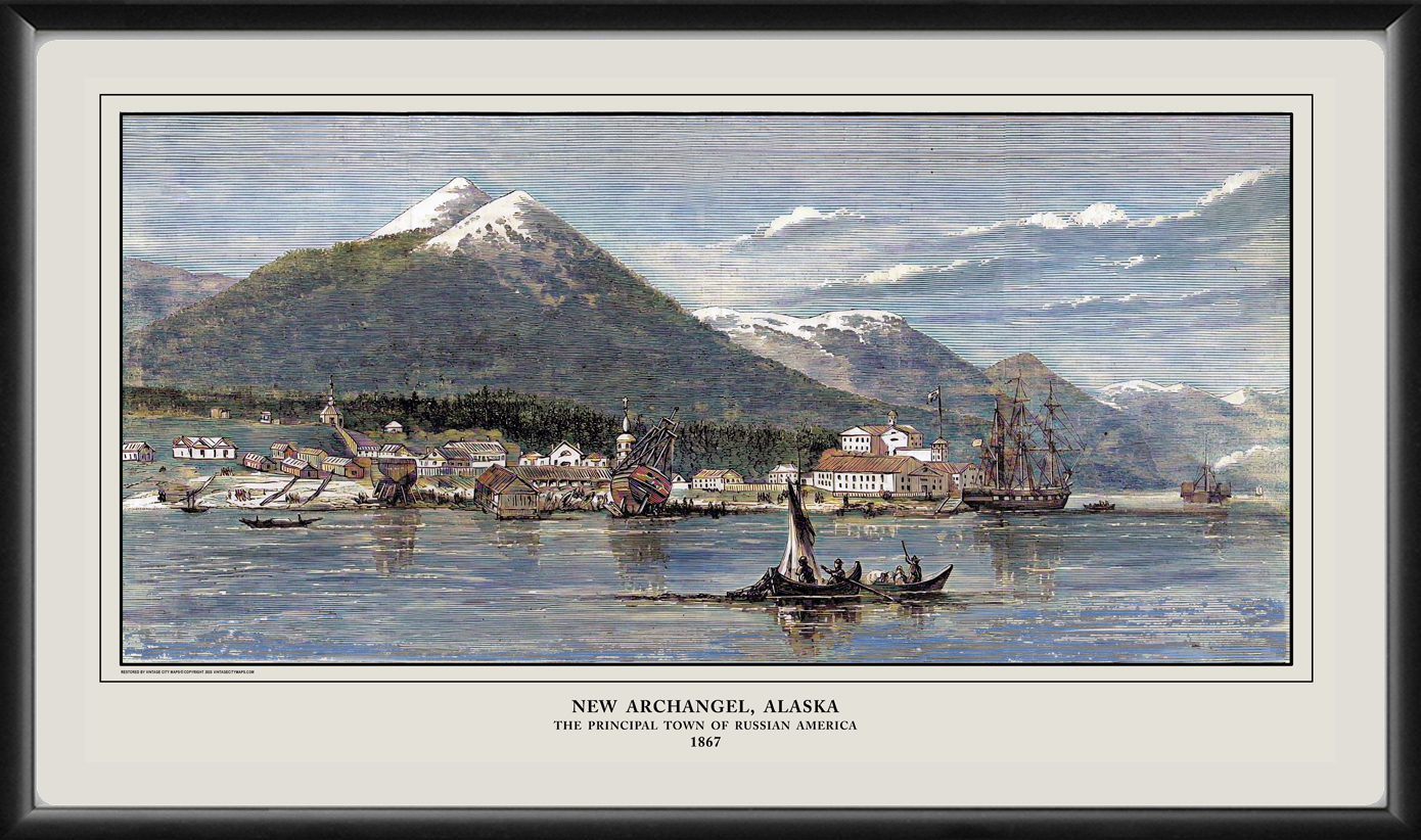 Restored panoramic view of Sitka (New Archangel), Alaska – the principal town of Russian America – from the original engraving published in Harper’s Weekly,1867