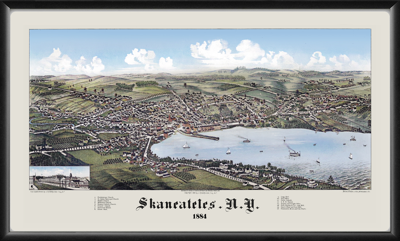Restored bird’s eye view of Skaneateles, New York, 1884 by Lucien R. Burleigh.