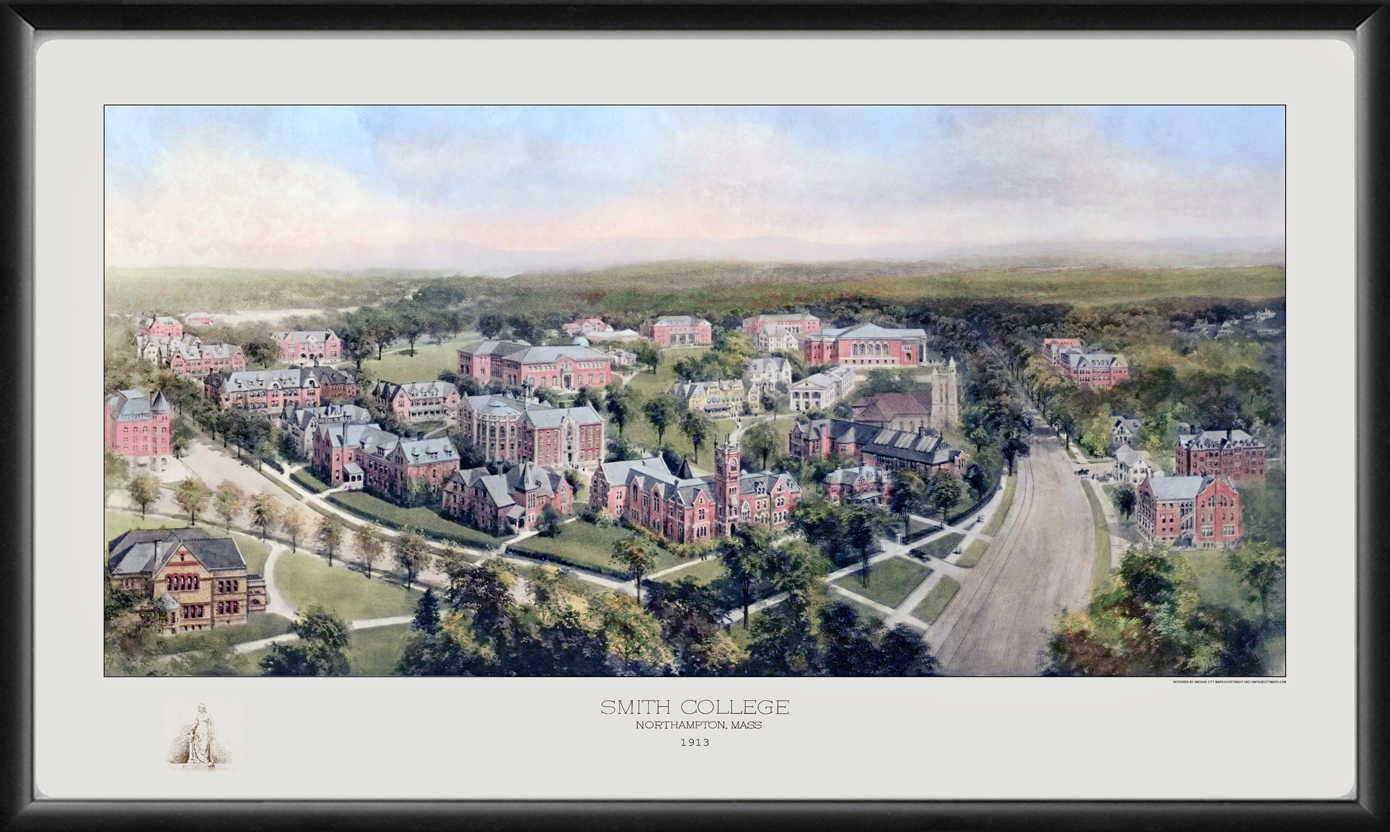 Restored bird’s eye view of Smith College, color version, in Northampton, Massachusetts, 1913 by Richard Rummell.