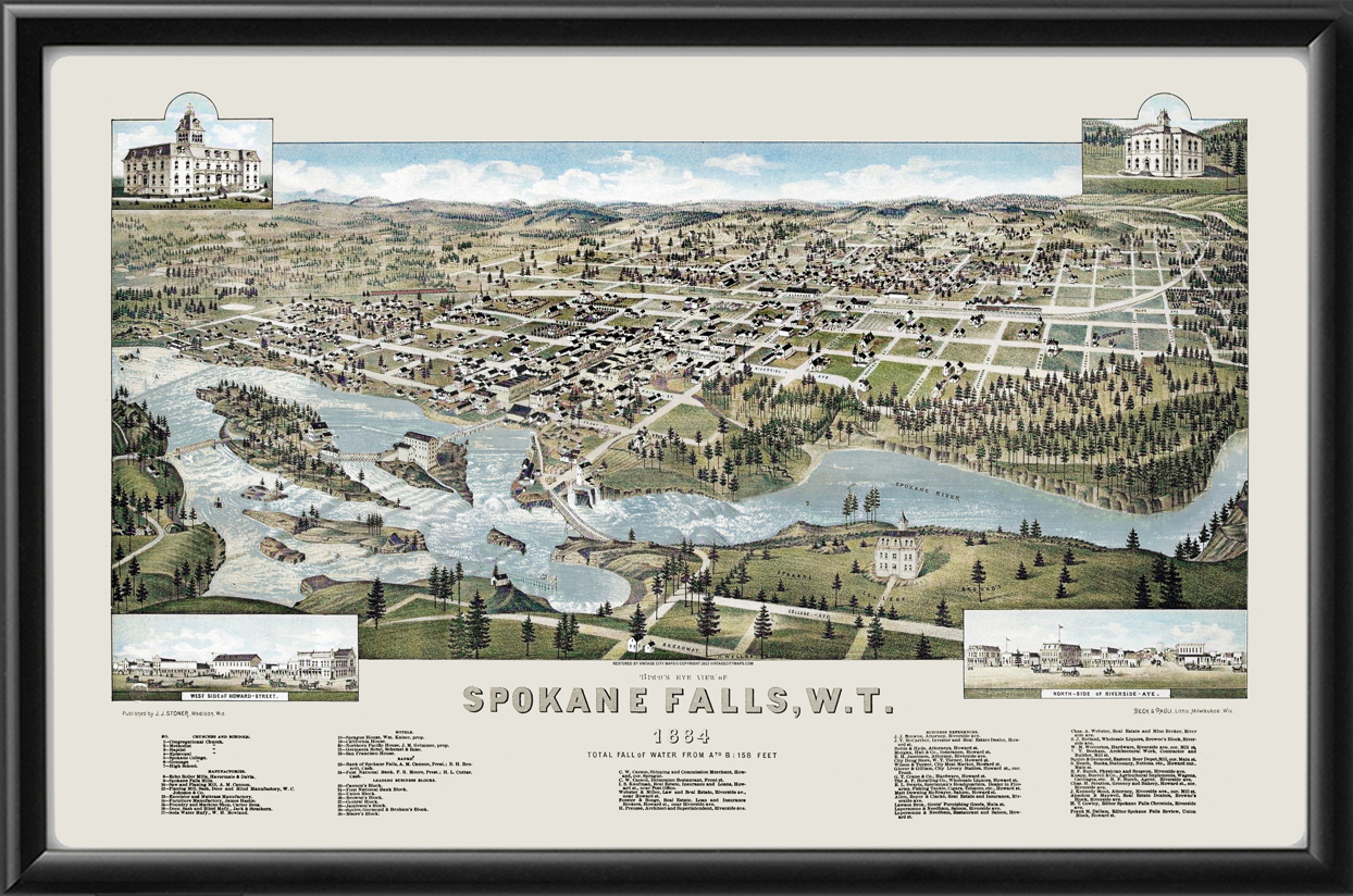 Restored bird’s eye view map of Spokane Falls, Washington, 1884 by J. J. Stoner.