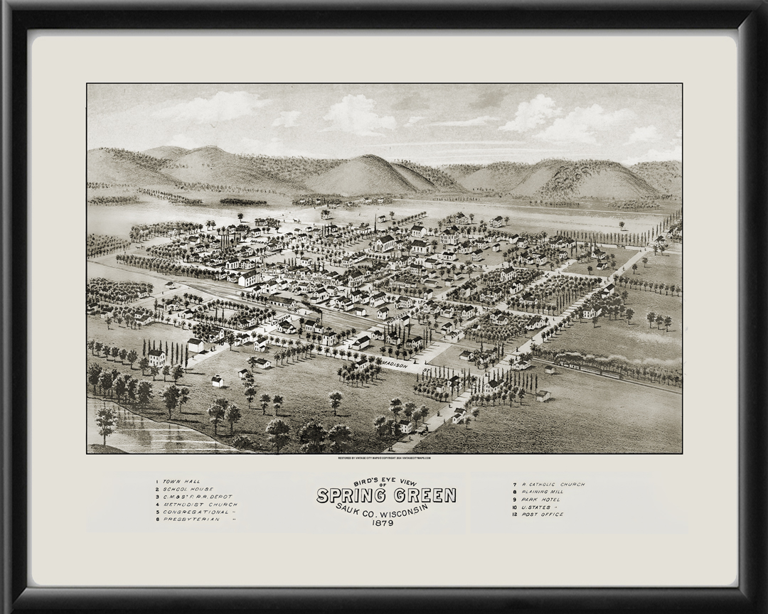 Restored bird’s eye view map of Spring Green, Wisconsin, 1879, by Howard Heston Bailey