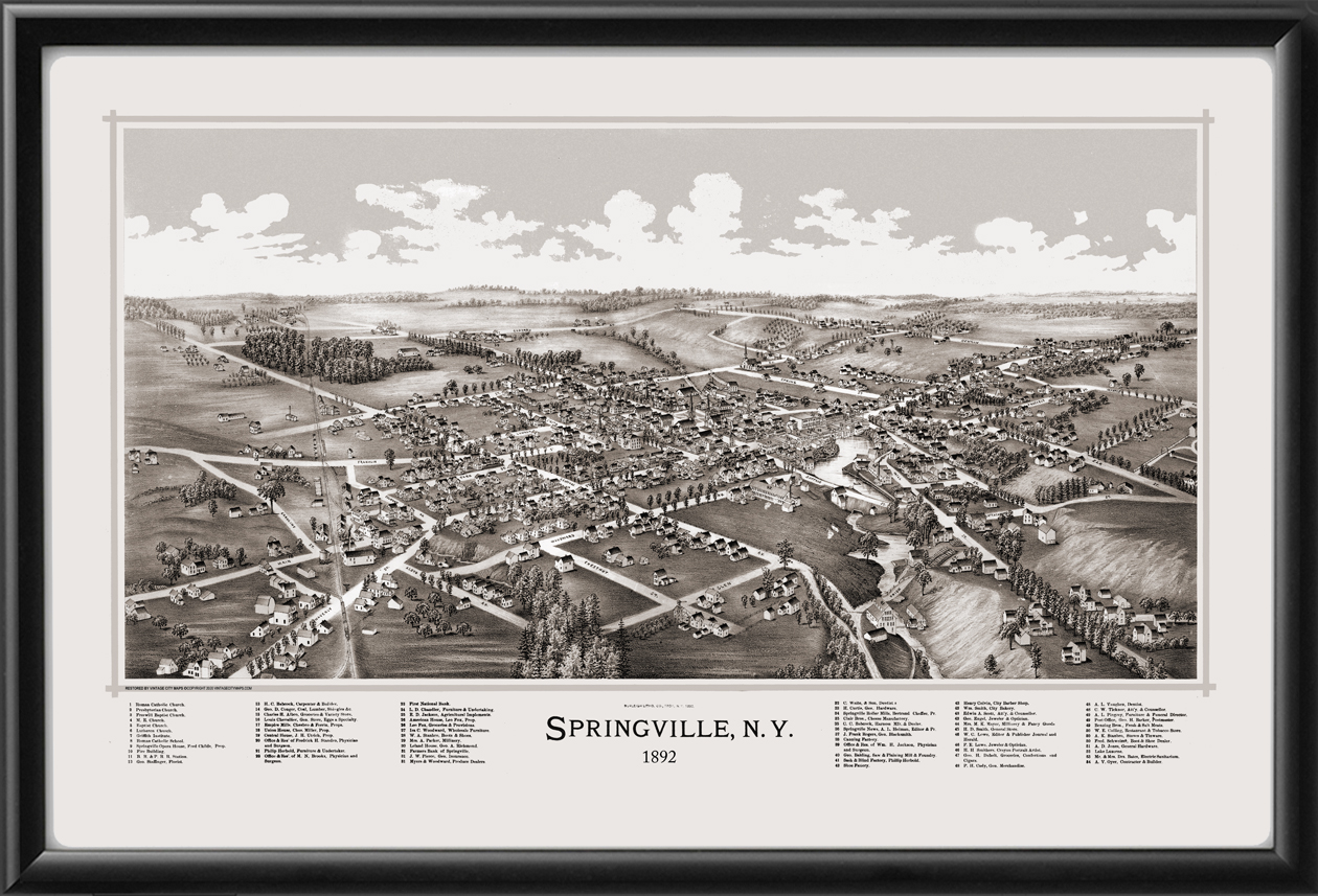 Restored bird’s eye view map of Springville, NY 1892 by Lucien R. Burleigh.