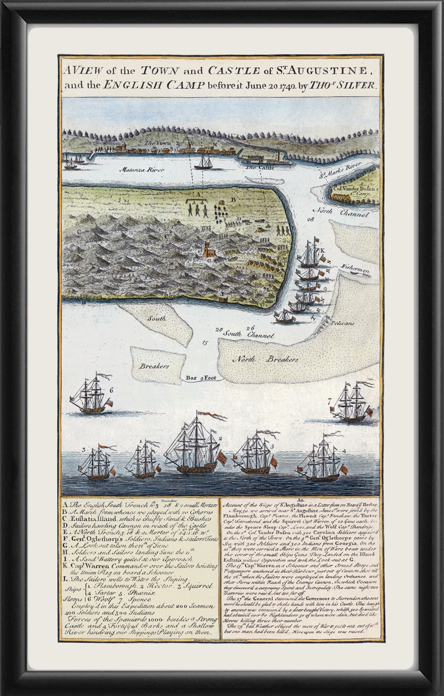 Restored bird’s eye view map of the town and castle of St. Augustine, Florida, 1740 by Thomas Silver, showing an account of the siege of St. Augustine.