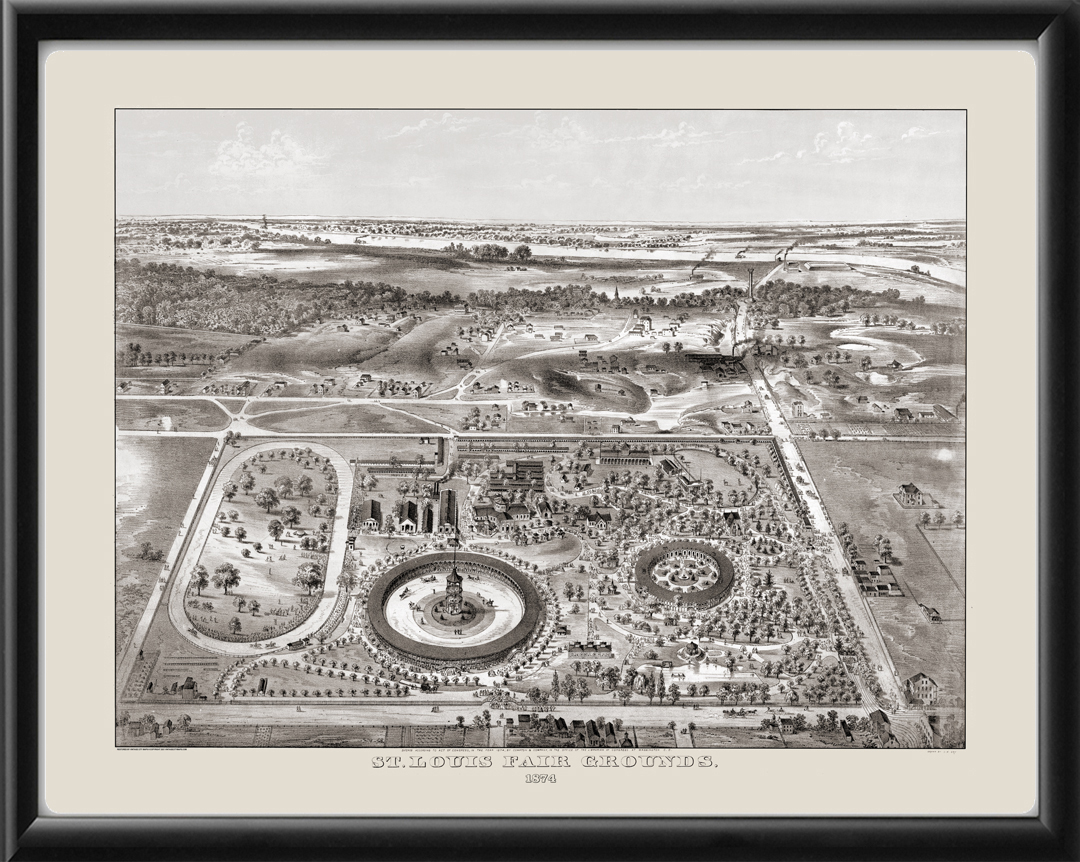 Restored bird’s eye view of the St. Louis Fairgrounds, 1874 by Camille N. Dry.