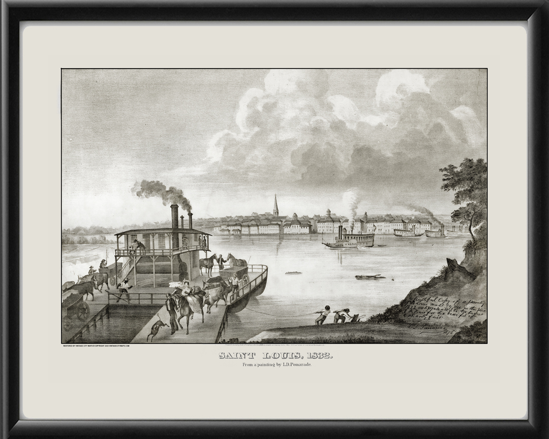 Restored view of St. Louis, Missouri, 1832 from East St. Louis, showing riverfront buildings, ferry with passengers and animals, and dockworkers. Includes a certification by original painter L.D. Pomarade. Produced in 1875 by Camille N. Dry and Richard J. Compton.