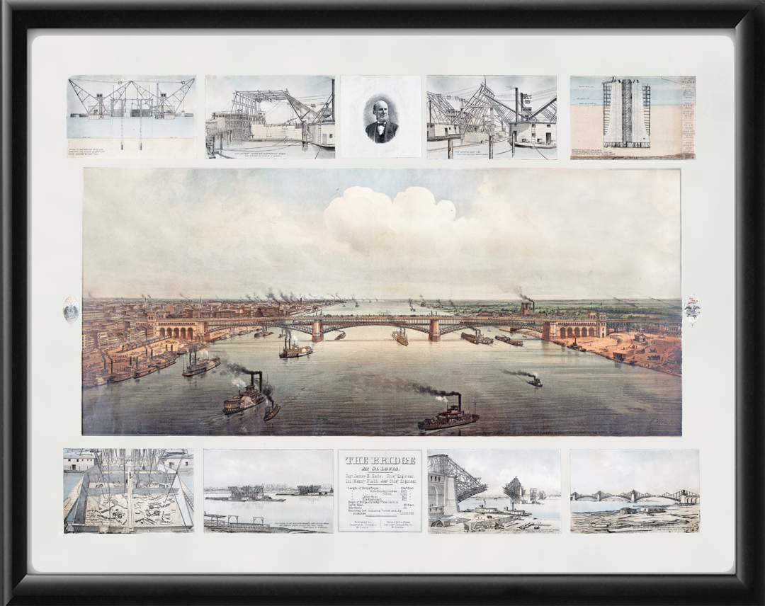 Restored panoramic view of St. Louis, Missouri, 1874 and the Eads Bridge, by F. Welcker. Includes photos and charts of the construction, by Captain James Eads, Chief Engineer.