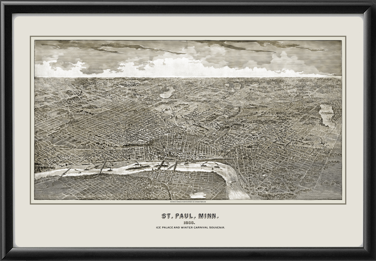 Restored bird’s eye view map of St. Paul, Minnesota, 1888 – Ice Palace and Winter Carnival Souvenir Map, engraved by Marr & Richards Co.