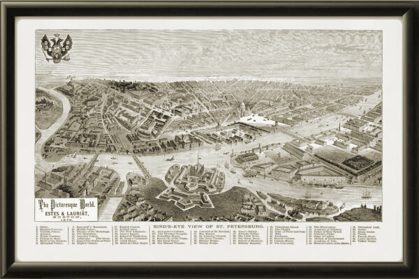 Restored bird’s eye view map of St. Petersburg, Russia 1876 by Estes & Lauriat.