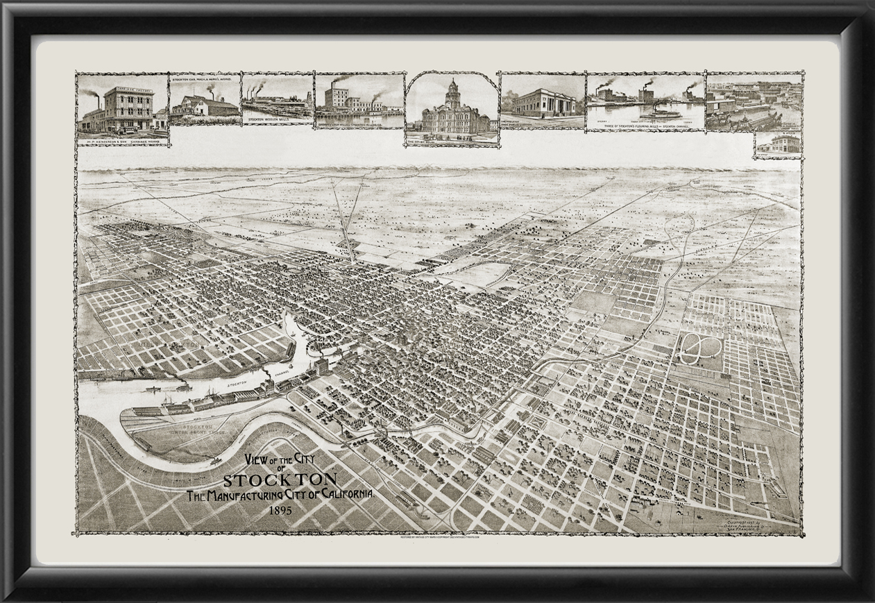 Restored bird’s eye view map of Stockton, California, 1895 by Dakin Publishing.