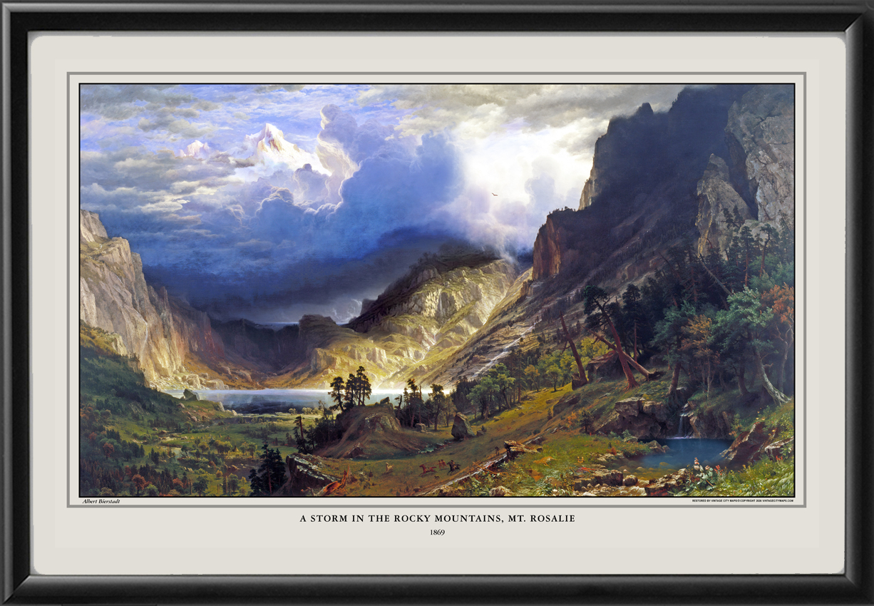 Restored panoramic view of a Storm in the Rockies, Mt. Rosalie, 1869 from the original painting by Albert Bierstadt. Mt. Rosalie was named for the artist’s wife, and was officially named Mt. Evans, now Mt. Blue Sky.