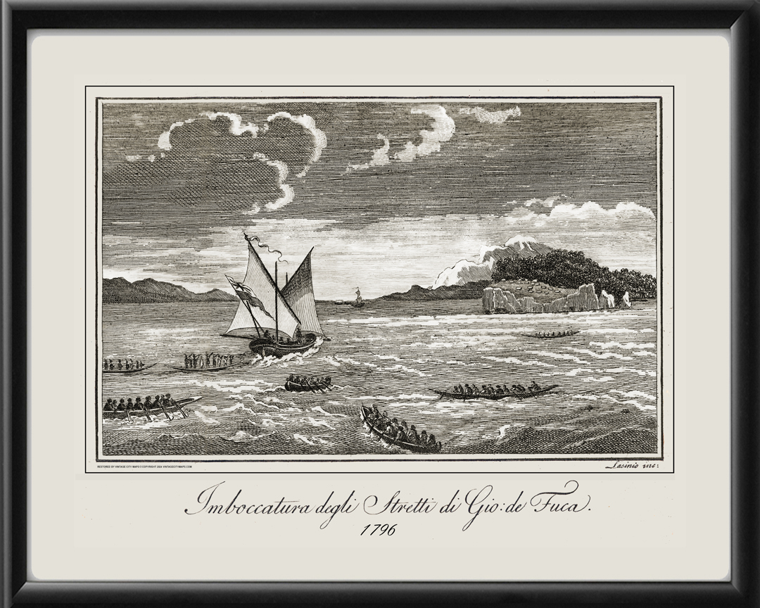 Restored view of Imboccatura degli Stretti di Gio de Fuca – Mouth of the Strait of Juan de Fuca in Washington Territory and Canada, from the original wood block engraving by Lasinio, and published by John Meares, 1796