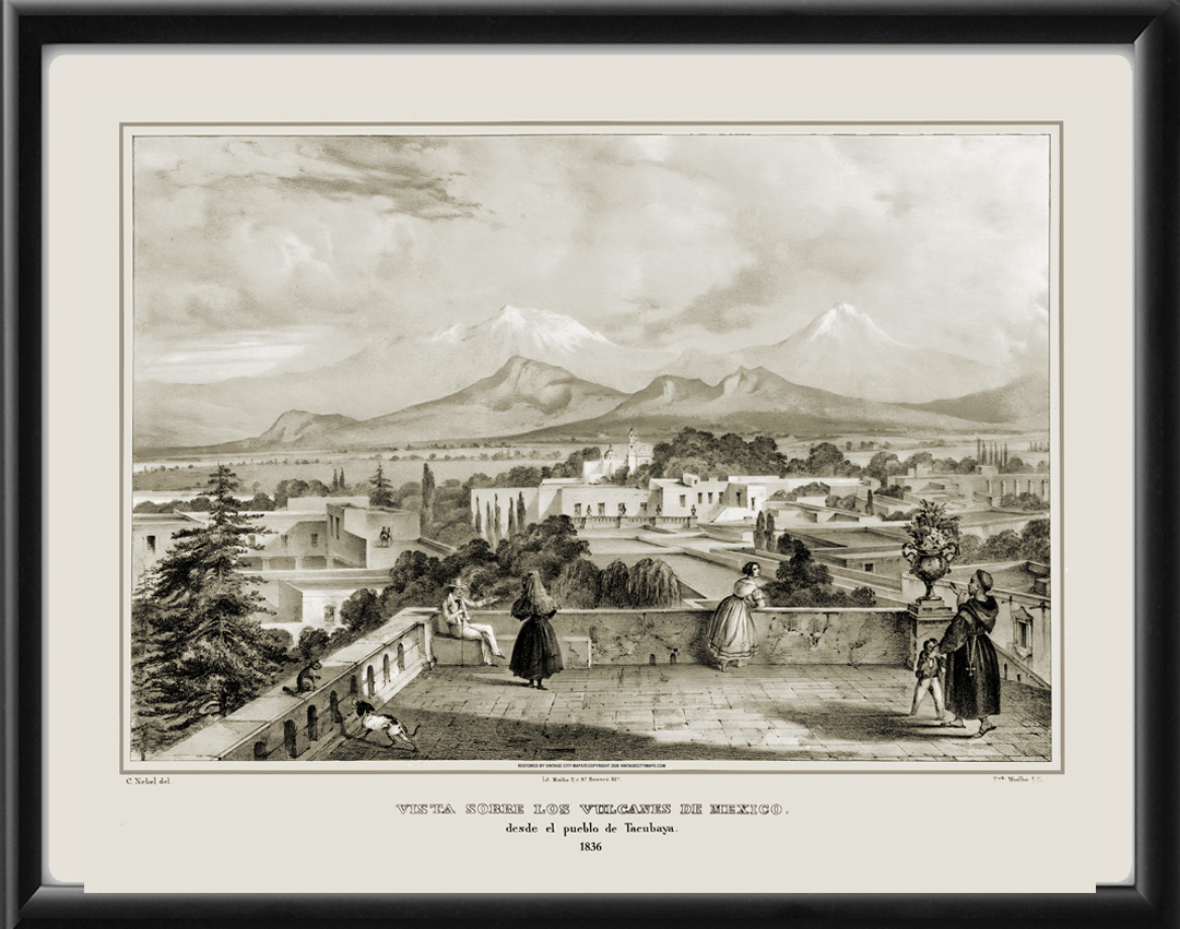 Restored bird’s eye view of Tacubaya, Mexico, showing the volcanos in the background, 1836 by Carl Nebel