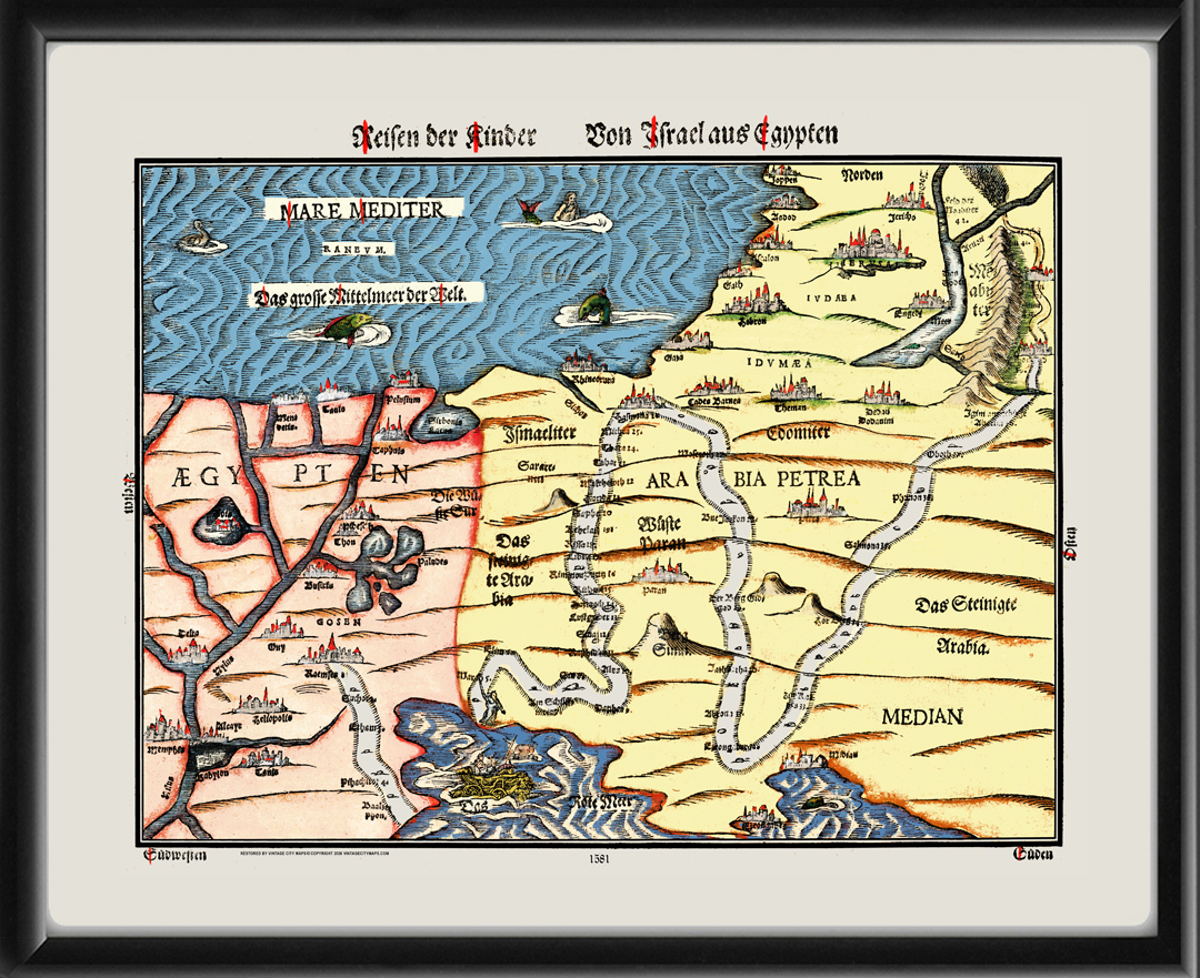 Restored pictorial map of The Holy Land, showing the exodus of the children of Israel from Egypt – from Goshen/Raamses southeast across a “Sea of Reeds” (Red Sea), through the Sinai Peninsula, to Mt. Sinai, from the original 1581 woodblock engraving by Heinrich Bünting