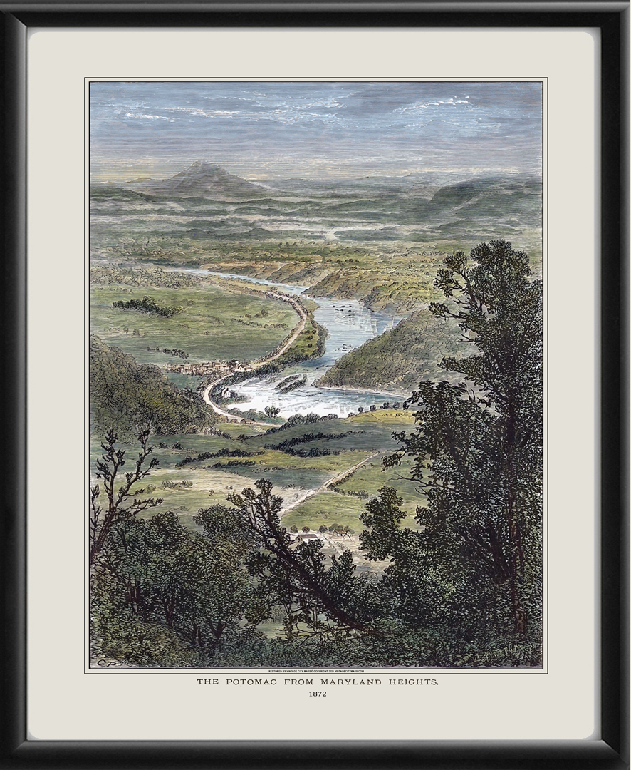 Restored bird’s eye view of the Potomac River from Maryland Heights, Maryland, the southern end of Elk Ridge, part of Harpers Ferry National Historical Park, West Virginia. From the original engraving by A. Meason, published in Picturesque America or the Land We Live In, 1872.