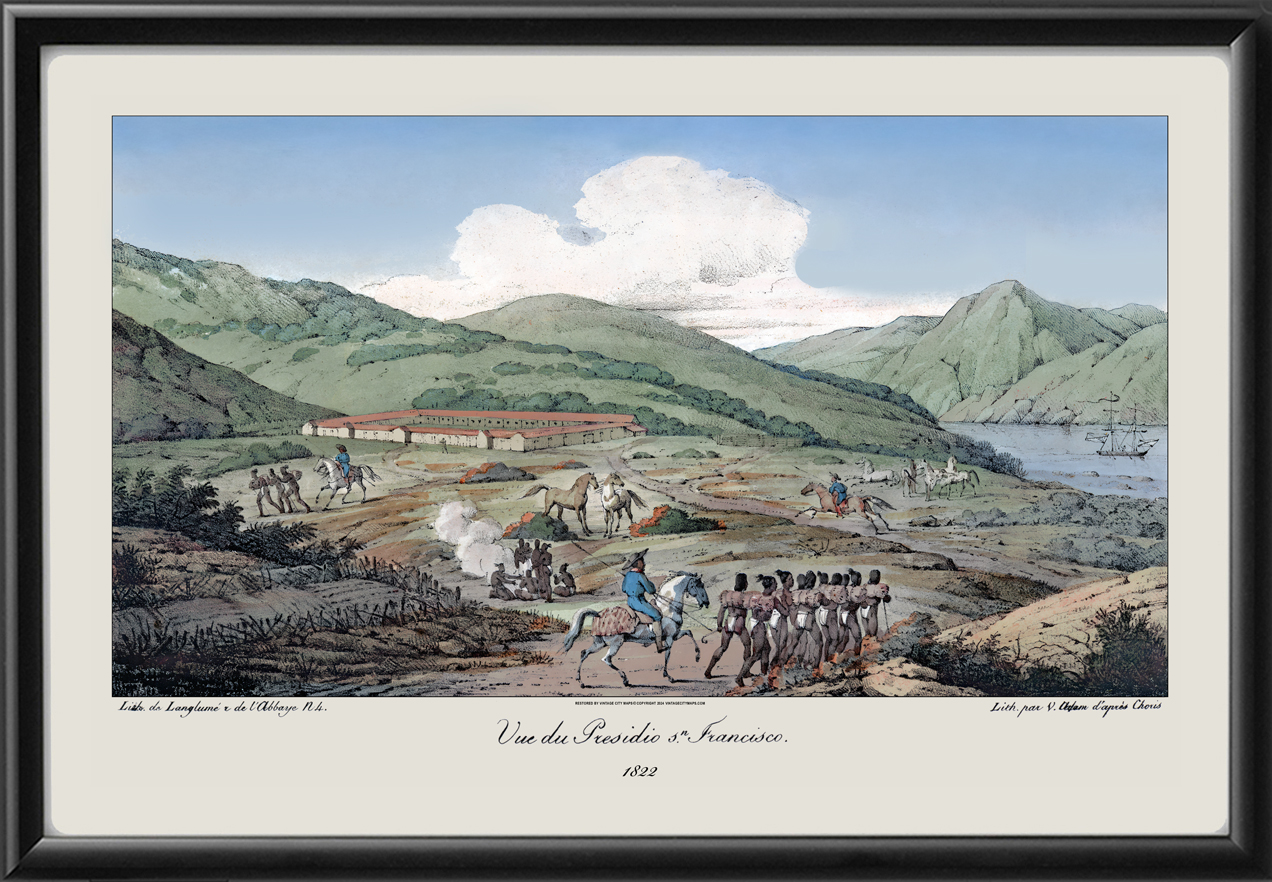 Restored panoramic view of The Presidio at San Francisco, 1822 by Louis Choris and Victor-Jean Adam, from the original lithograph with applied watercolor