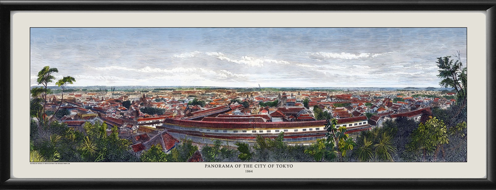 Restored panoramic view of Tokyo (Iedo) Japan 1864 as viewed from the Atago-yama hill, showing the great residences of the powerful feudal landowners, from the original woodblock engraving published in Illustrated London News.