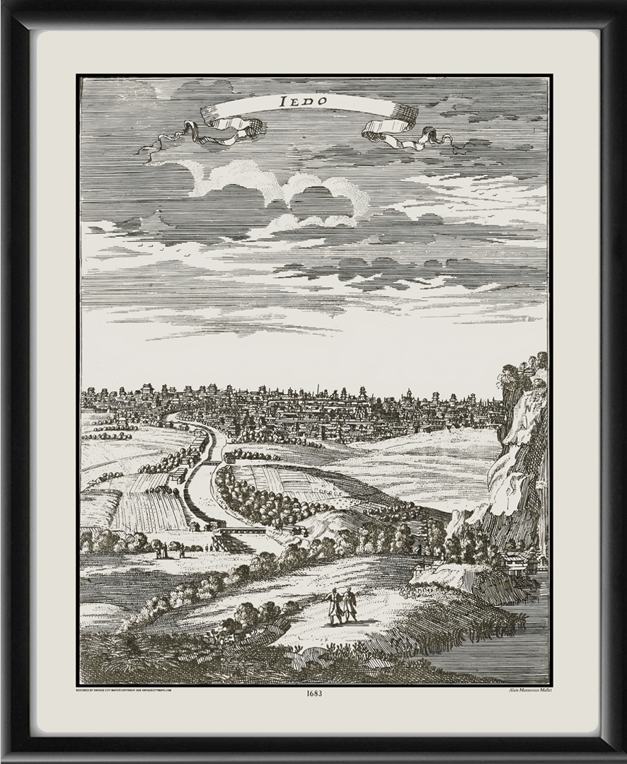 Restored bird’s eye view of Tokyo (Iedo) Japan, 1683 from the original engraving by Alain Mannesson Mallet
