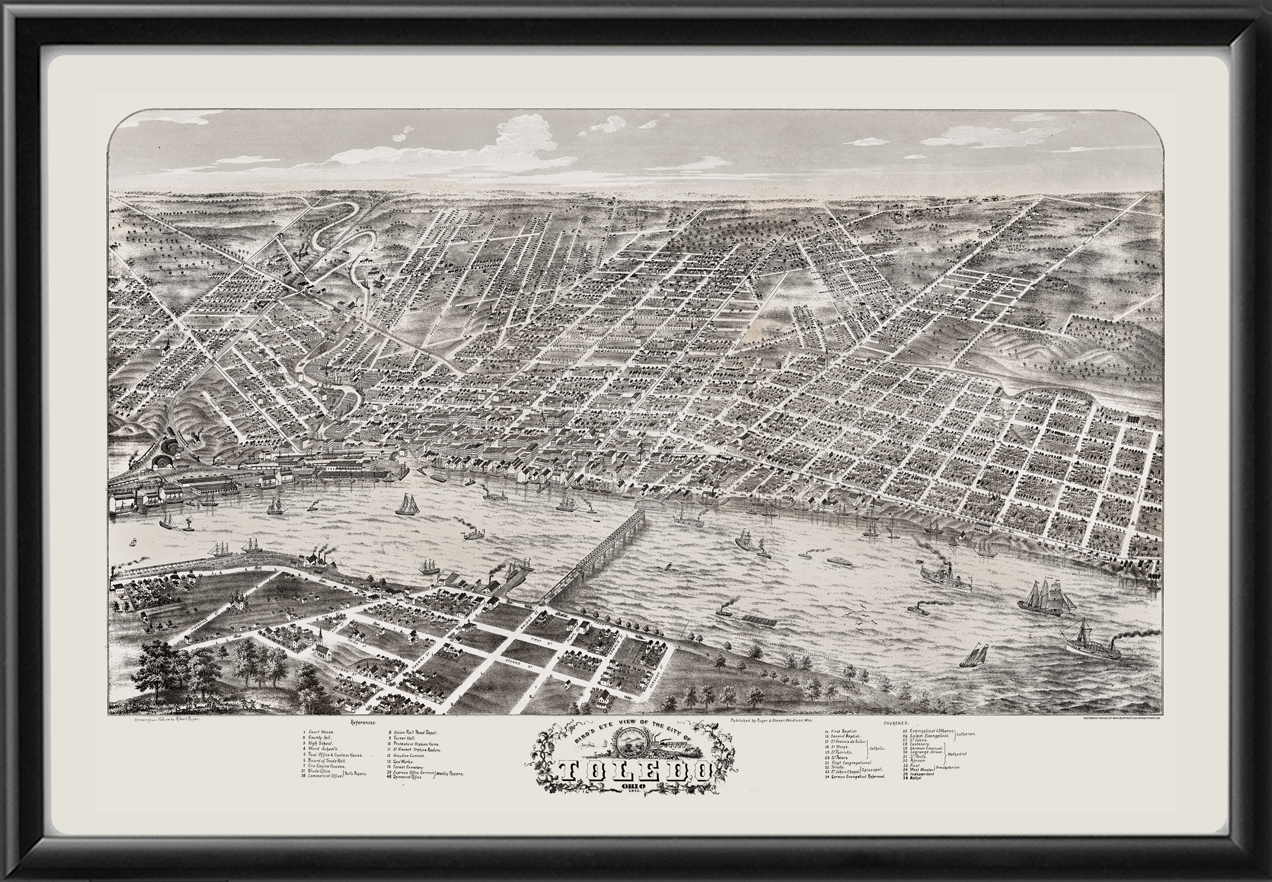 Restored bird’s eye view map of Toledo, Ohio, 1870 by Albert Ruger.
