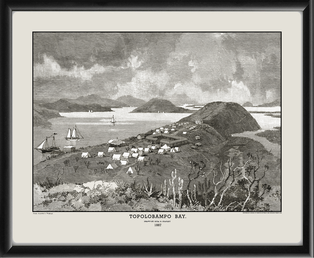 Restored bird’s eye view of Topolobampo Bay, Sinaloa, Mexico 1887, from the original engraving by Ella B. Stanley and published in Harper’s Weekly