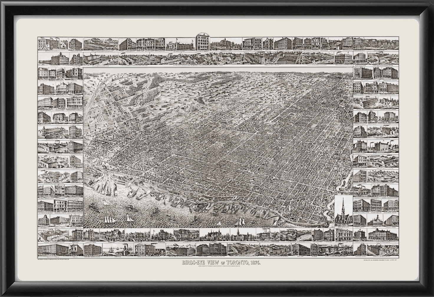Restored bird’s eye view map of Toronto, Canada 1876 by Peter A. Gross. Features over 125 insets of factories, stores, churches, and schools. P. A. Gross walked every avenue, street, lane, and alley to produce this view of Toronto. He sketched every shop, dwelling, and factory in Toronto—14,000 private and public buildings in all—with “a faithfulness and a minuteness that excites astonishment and admiration in all beholders,†according to Illustrated Toronto (1877), a guidebook published to accompany the map.