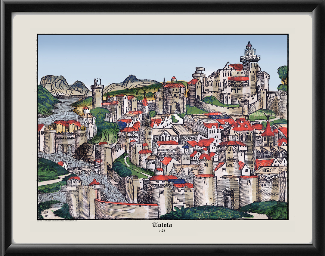 Restored bird’s eye view of Toulouse, France, 1493 from the original woodblock engraving from Hartman Schedel’s “Liber Chronicum” (Nuremberg Chronicle)