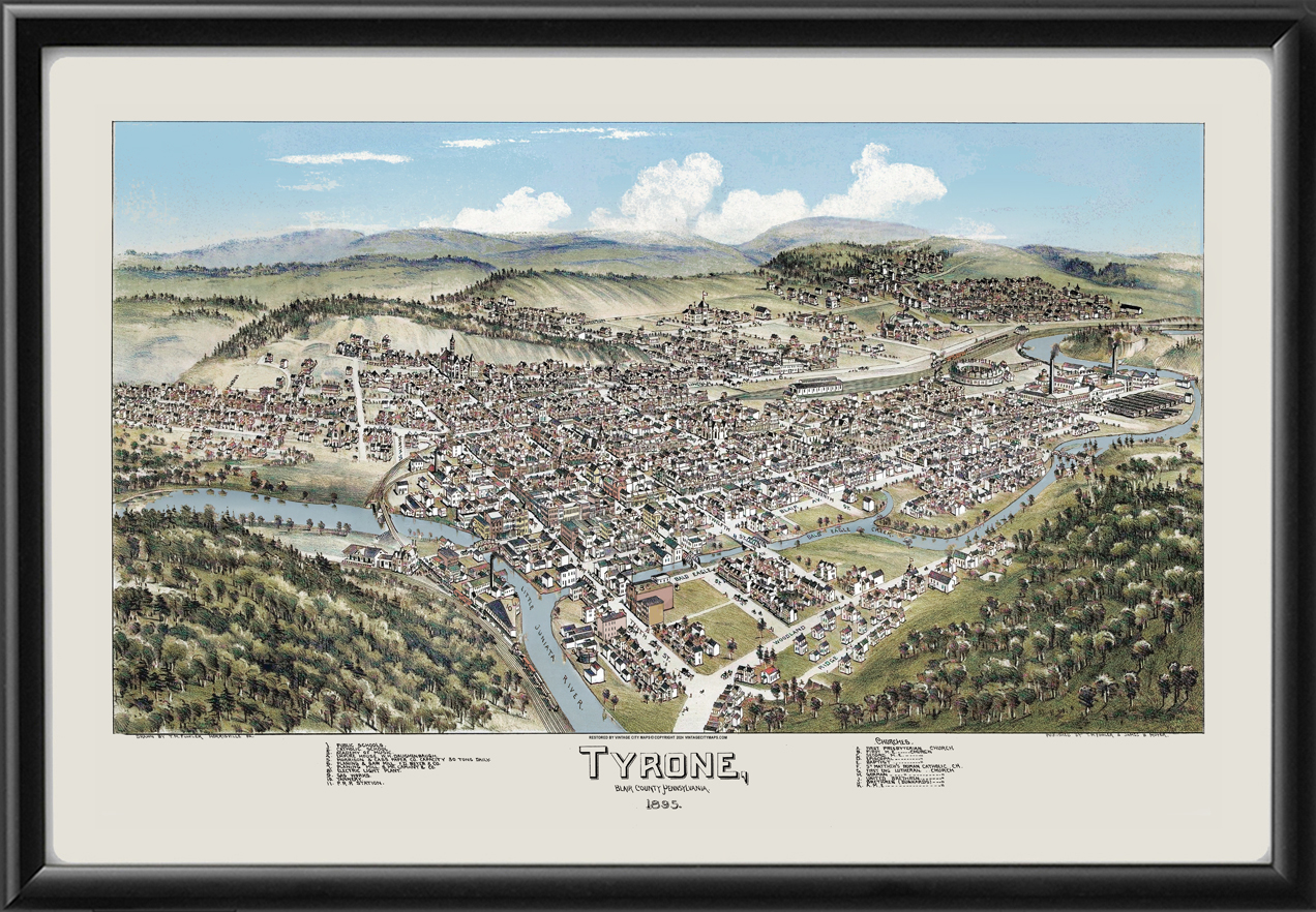 Restored bird’s eye view map of Tyrone, Pennsylvania, 1895 by Thaddeus Mortimer Fowler.