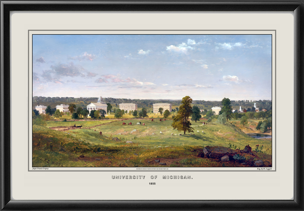 Restored panoramic view of the University of Michigan in Ann Arbor, Michigan, 1855, from the original painting by Jasper Cropsey.