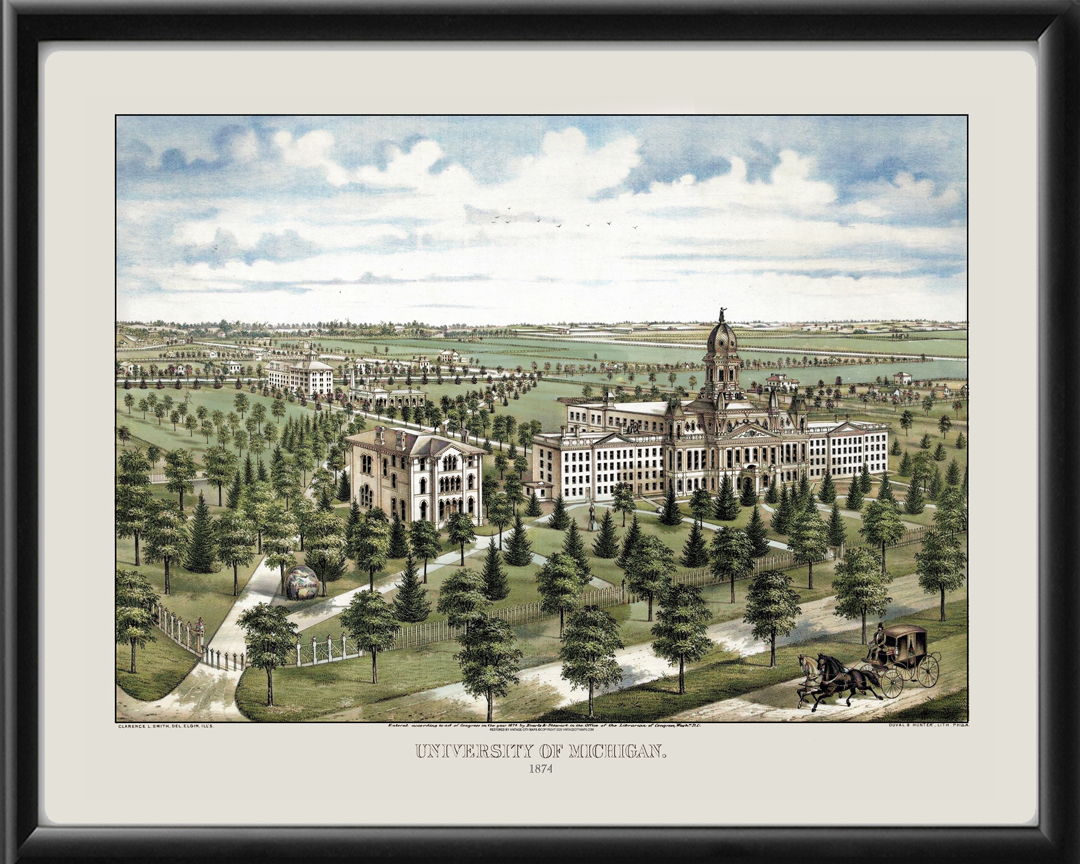 Restored bird’s eye view of the University of Michigan in Ann Arbor, 1874, color version, by Clarence L. Smith. Showing University Hall which was demolished in 1950.