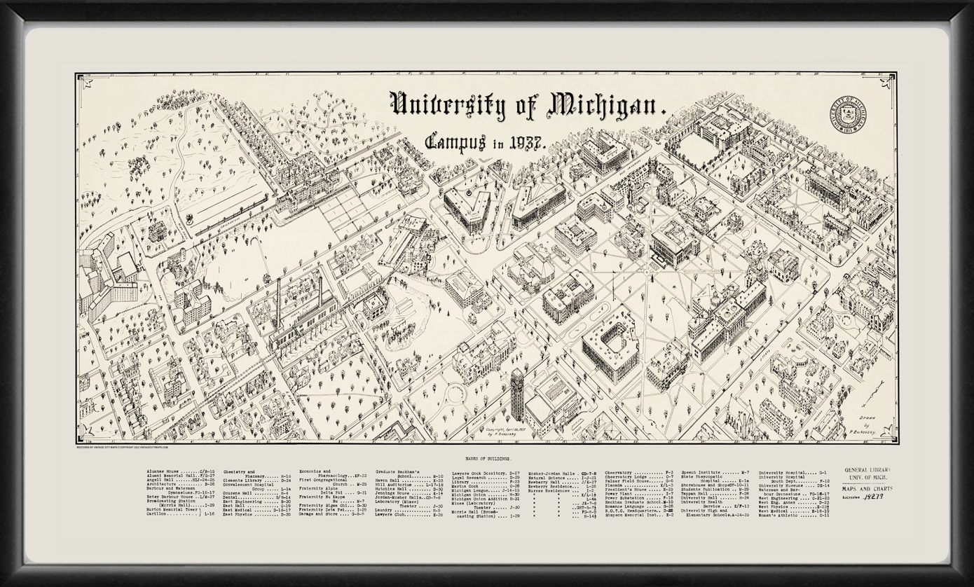Restored bird’s eye view map of the University of Michigan campus in 1937 by Paul Bukovsky.
