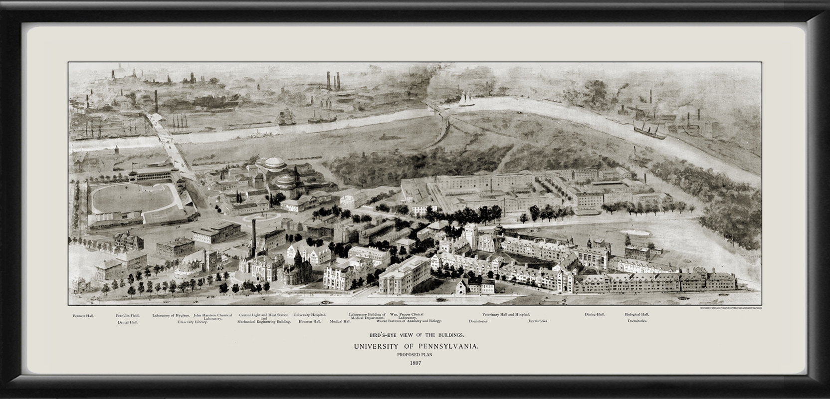 Restored bird’s eye view of the University of Pennsylvania in Philadelphia, as proposed in 1897 and illustrated John Bach McMaster