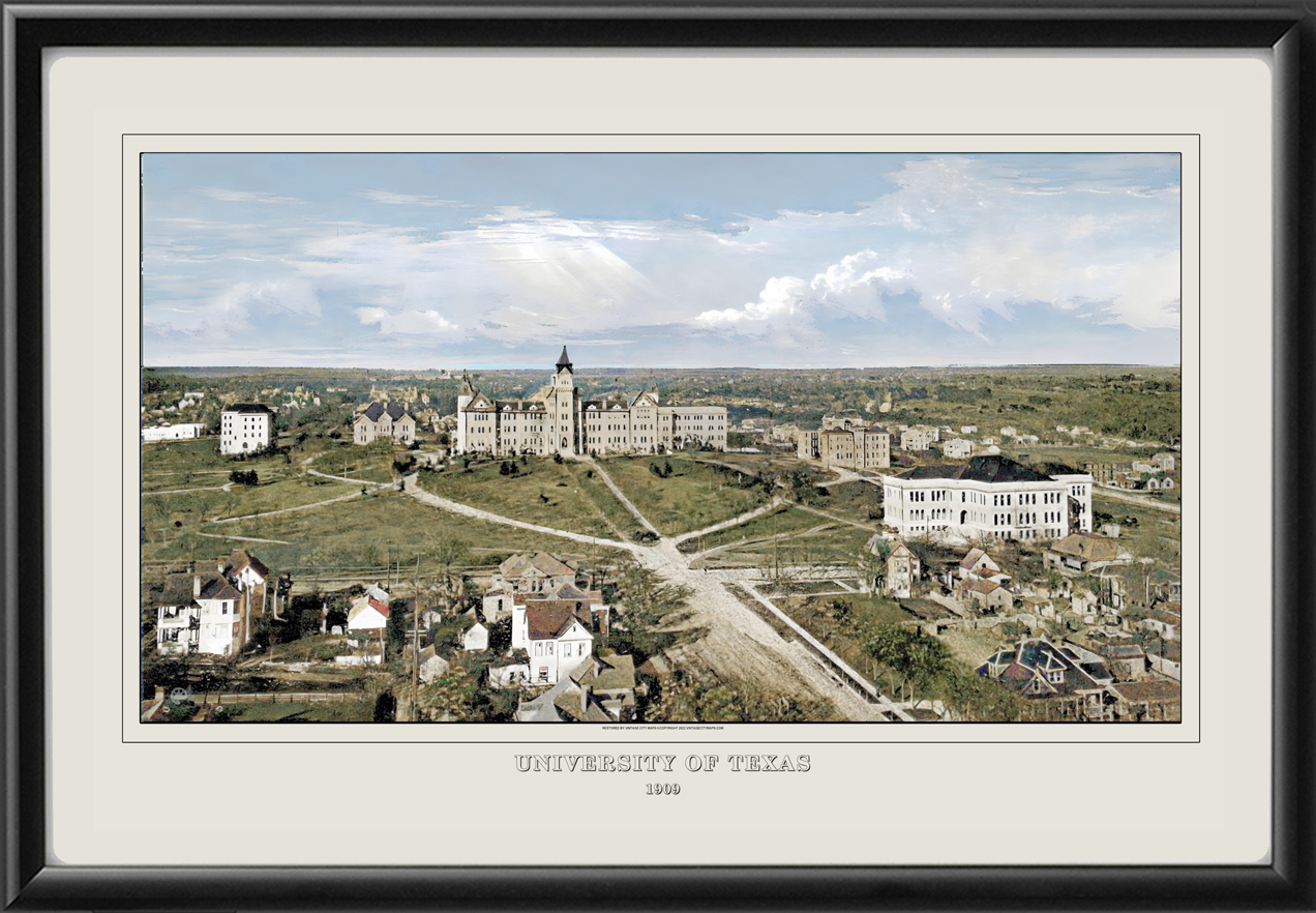Restored panoramic view of the University of Texas, Austin, 1907, showing the original Old Main, constructed in 1887 and demolished in 1935 to make room for the new Main Building and Tower.