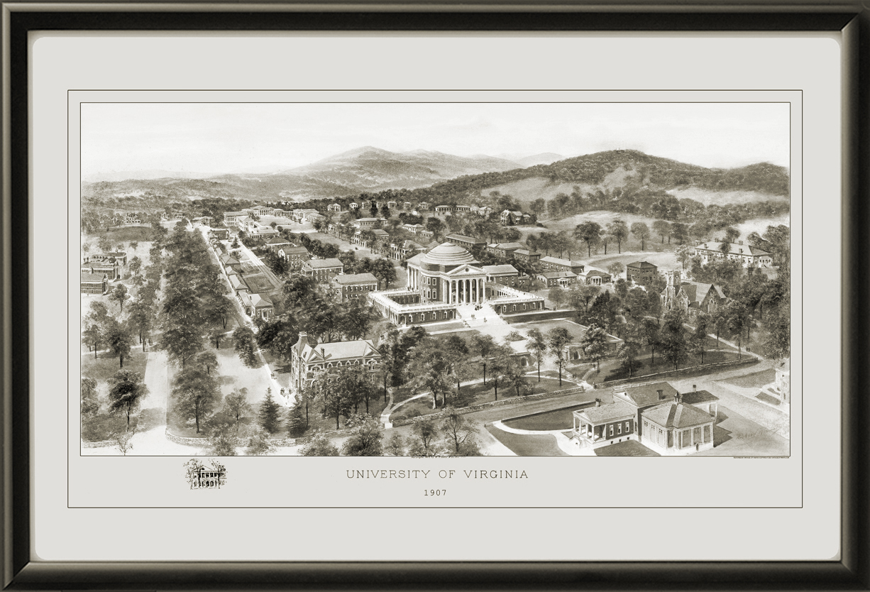 Restored bird’s eye view of the University of Virginia, Charlottesville, 1907 by Richard Rummell.