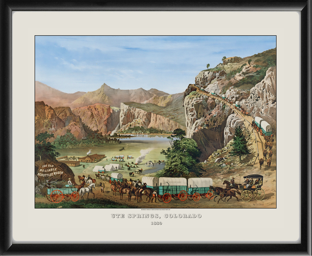 Restored bird’s eye view of Ute Pass near Colorado Springs, Colorado, 1880, produced as a promotional piece for The Old Reliable Schuttler Wagon