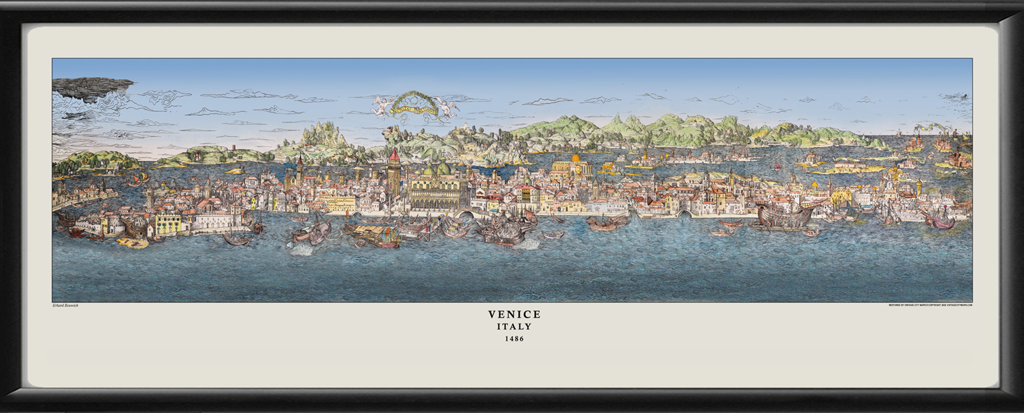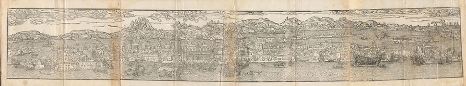 Restored panoramic view of Venice, Italy, 1486 by Dutch artist Erhard Reuwich, made from four woodcut blocks joined together, and published in Peregrinatio in terram sanctam (Journey to the Holy Land), by Bernhard von Breydenbach