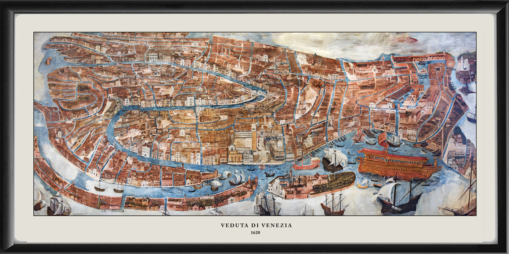 Restored bird’s eye view of Venice, Italy, 1620 from the original oil painting by Gian Battista Arzenti.