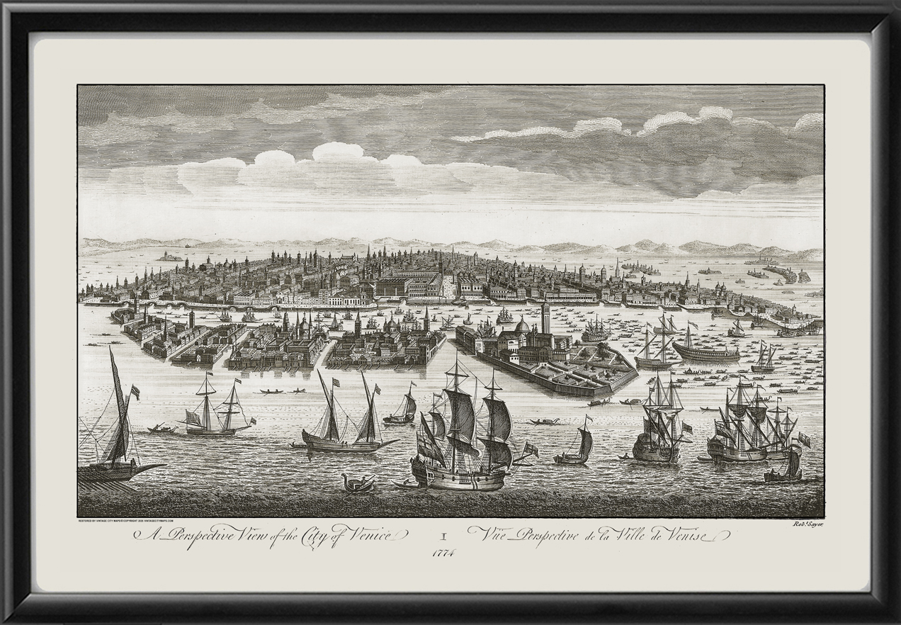 Restored bird’s eye view map of Venice, Italy, from Guidecca near San Giorgi Maggiore towards Piazza San Marco and the Lido, 1774 by Robert Sayer