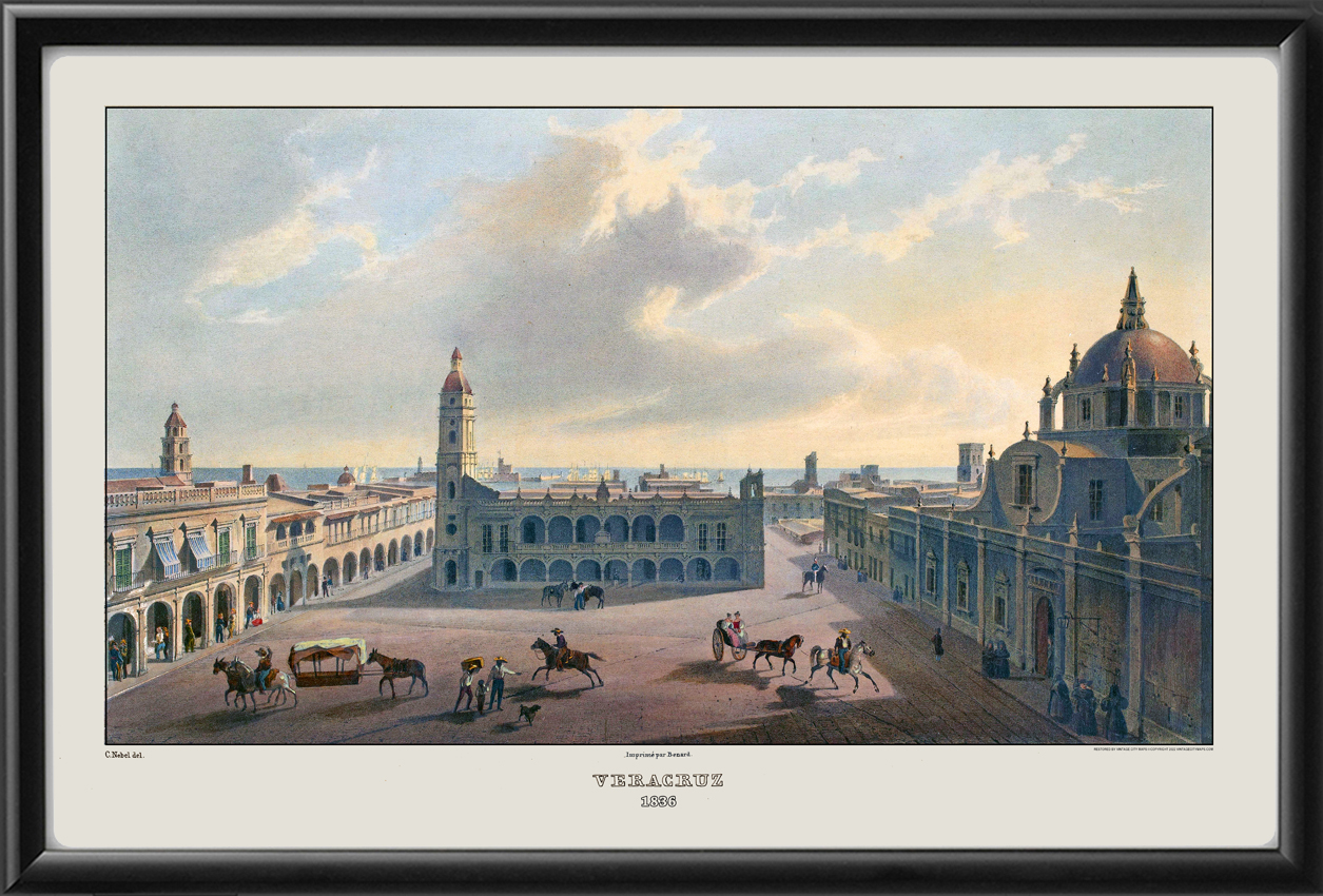 Restored panoramic view of the main plaza in Veracruz, Mexico, 1836 by Carl Nebel.