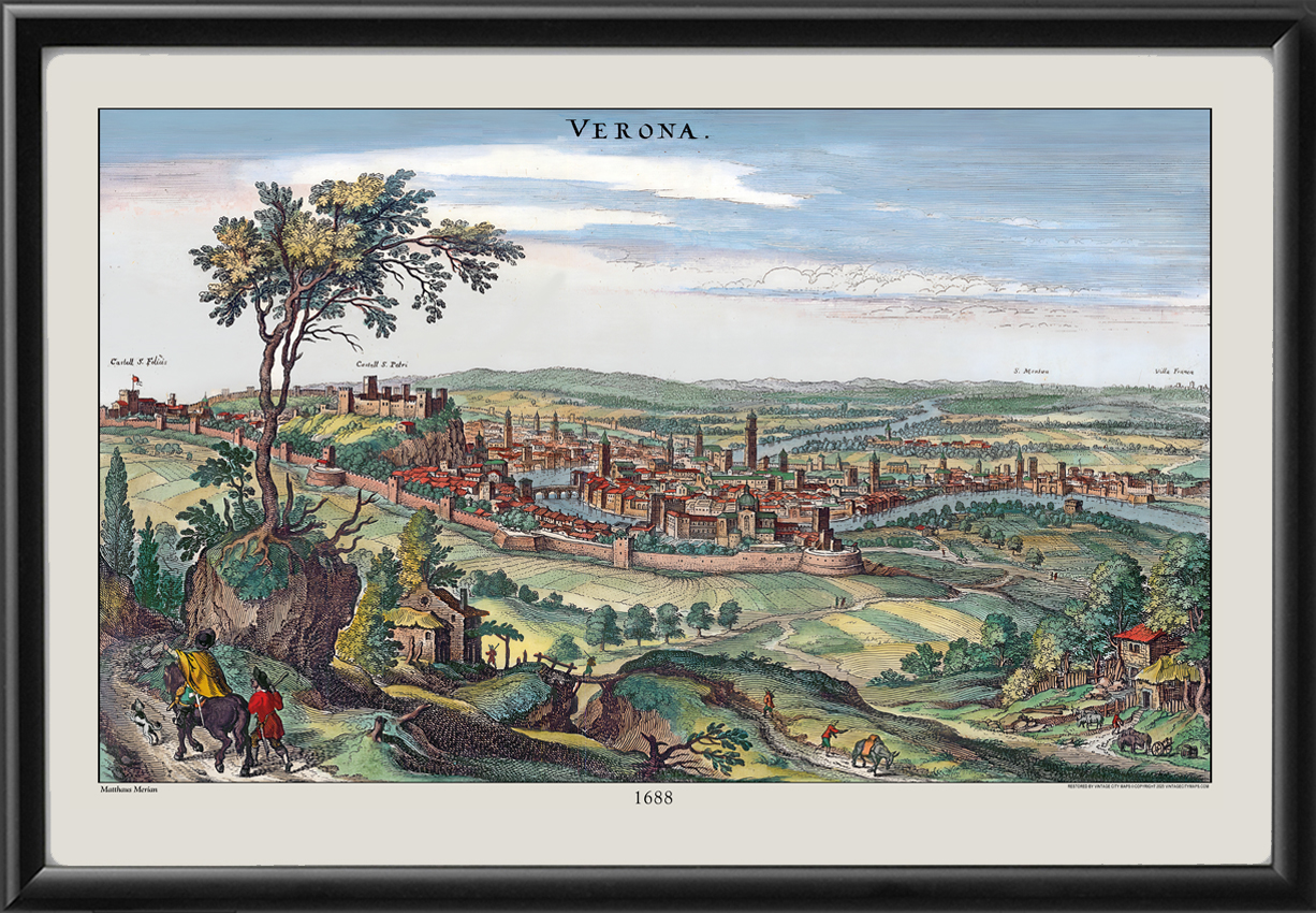 Restored bird’s eye view of Verona, Italy, 1688 from the original engraving by Matthaus Merian.