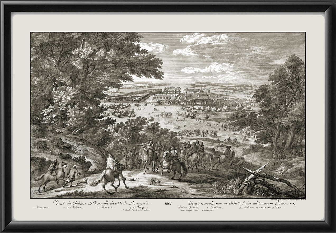 Restored bird’s eye view of the Palace of Versailles from the orangery side, 1664, drawn A.F. Vander Meulen and engraved by Antoine-Francois Bauduins