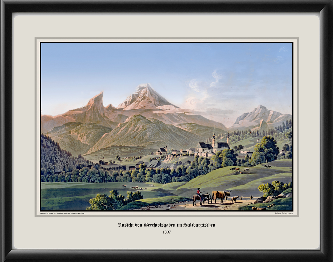 Restored bird’s eye view of Berchtesgaden in Salzburg, Germany, 1807 by Johann Jakob Strüdt.