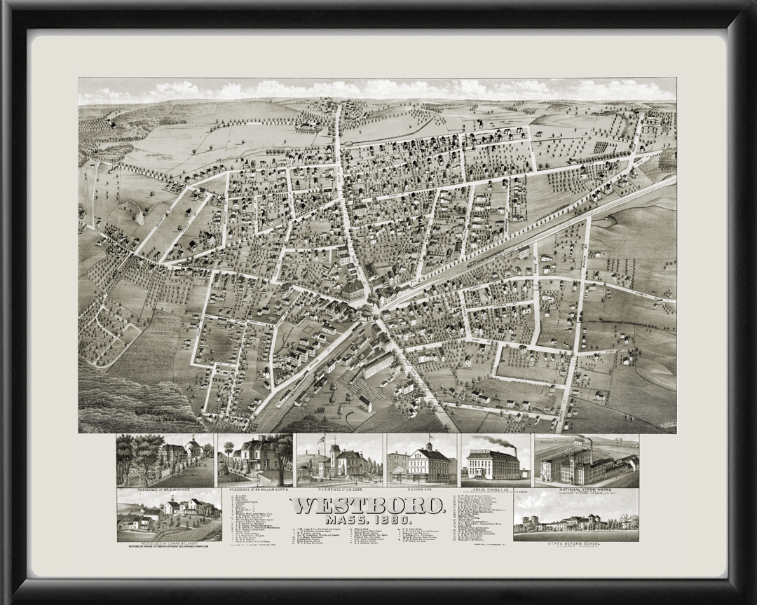 Restored bird’s eye view map of Westboro (Westborough), Massachusetts, 1880 by Beck & Pauli.