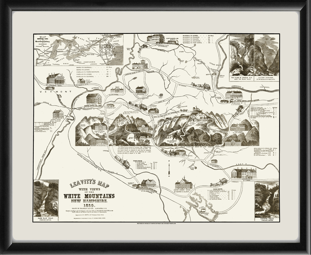 Restored bird’s eye view map with views of the White Mountains, New Hampshire, 1859 by Franklin Leavitt. His series of folk art maps produced from 1852 -1888 of the White Mountains captured the history of the region, promoted tourist destinations, and offered humorous depictions that contributed to the area’s legends and lure.