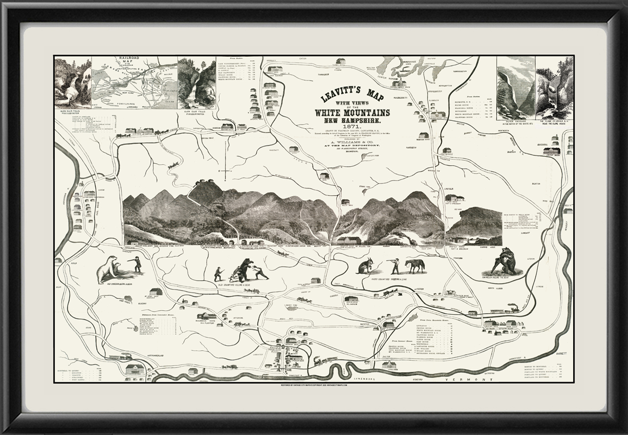 Restored bird’s eye view map with views of the White Mountains, New Hampshire, 1882 by Franklin Leavitt. His series of folk art maps produced from 1852 -1888 of the White Mountains captured the history of the region, promoted tourist destinations, and offered humorous depictions that contributed to the area’s legends and lure.