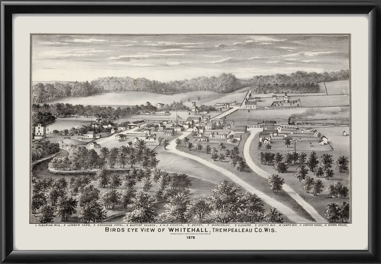 Restored bird’s eye view of Whitehall, Wisconsin, 1878 by Snyder, Van Vechten & Co.