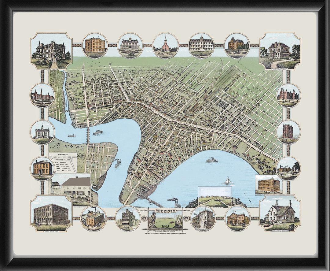 Restored bird’s eye view map of Winnipeg, Manitoba, Canada, 1884 by W. G. Fonseca