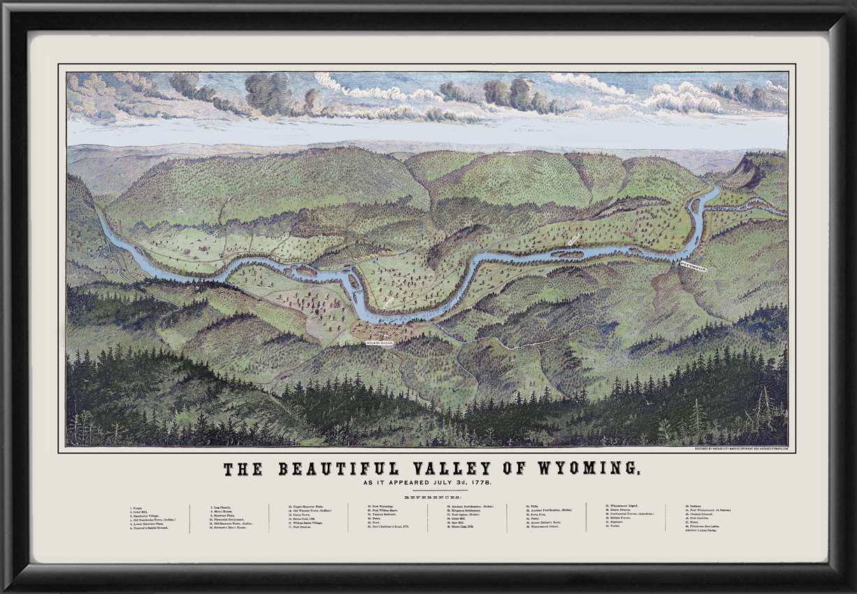 Restored bird’s eye view of Wyoming Valley, Pennsylvania, as it appeared in 1778 during the American Revolution, produced in 1878 by Th. Fleming and showing the settlements of Wilkes Barre, Kingston, Wyoming, and Pittston along the Susquehanna River.