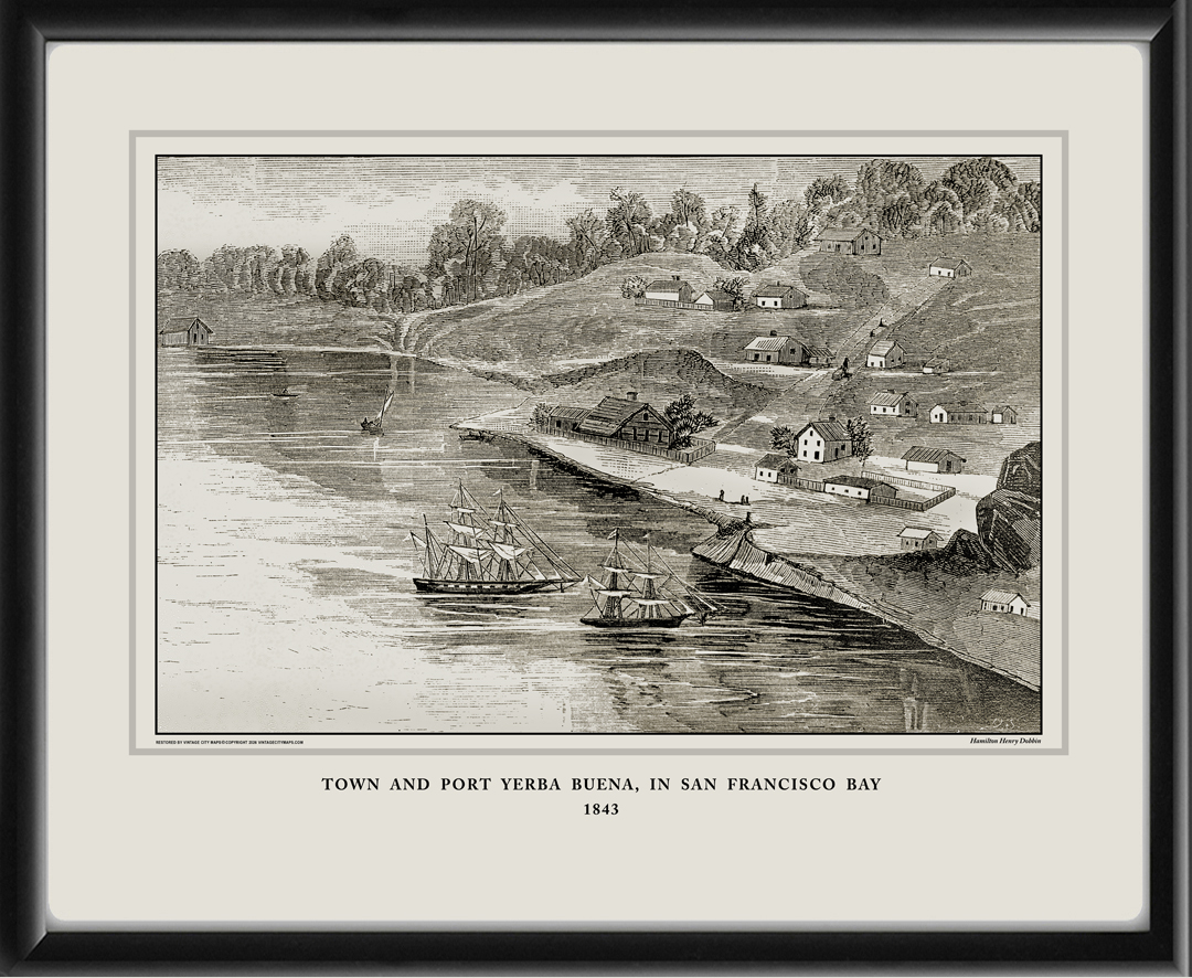 Restored bird’s eye view of the town and port of Yerba Buena (San Francisco) in San Francisco Bay, 1843 from the original engraving by Hamilton Henry Dobbin