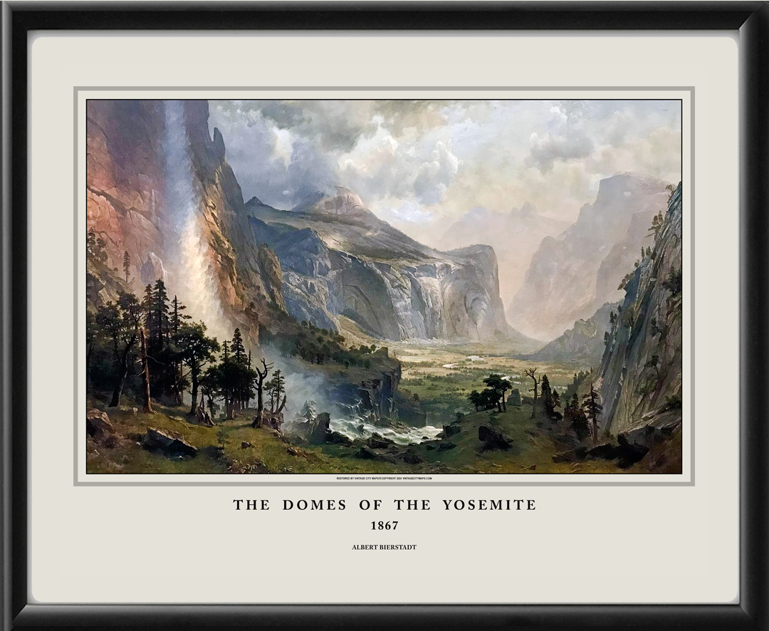 Restored panoramic view of The Domes of the Yosemite, viewed from the Yosemite Falls Trail east towards Half Dome; from the original 9.5′ x 15′ oil painting by Albert Bierstadt.
