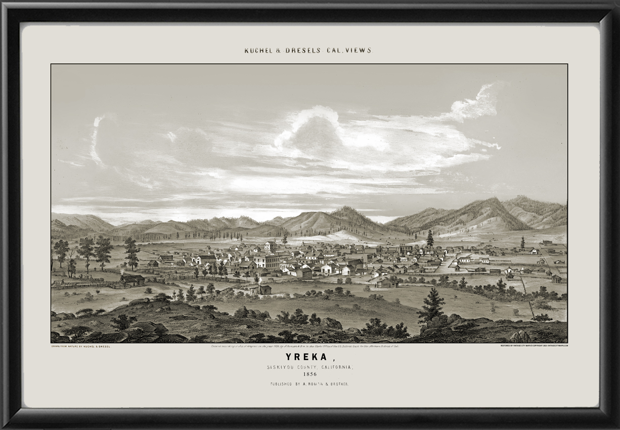 Restored bird’s eye view of Yreka, California, 1856 by Kuchel & Dresel. Shop our amazing catalog of restored bird’s eye view and panoramic maps.