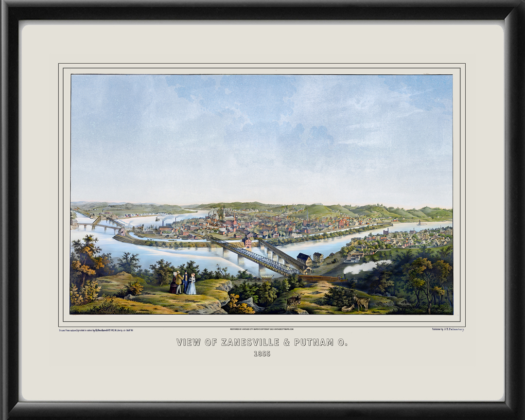 Restored bird’s eye view of Zanesville & Putnam, Ohio, on the Muskingum River, 1855 Edward Sachse